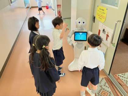 1時間め終了後、1年生がペッパーさんと遊びにやってきました。1年生の教室が一番近いので、すぐです。
