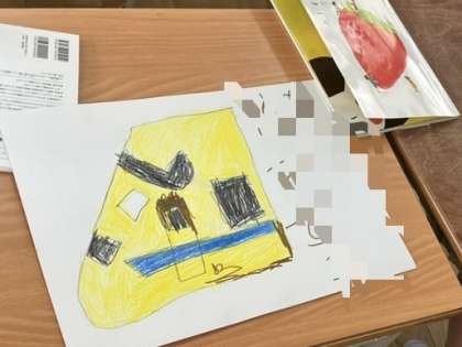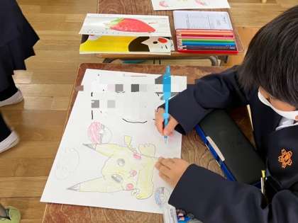 1年生のお絵描きの時間です。見本もないのに、みんなどんどん描いていきます。色鉛筆の色を使って、上手に描いています。すごい!