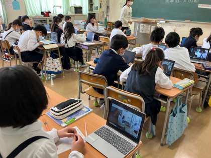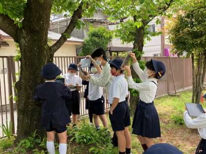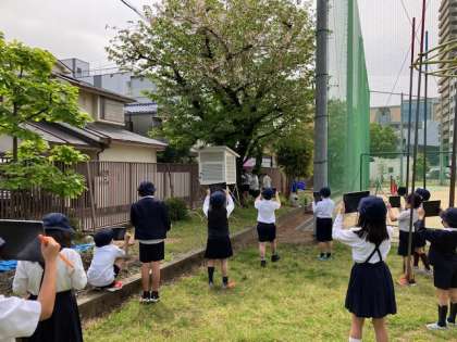 2年生の理科の授業、桜の木の観察をします。教室で桜の木と花、虫メガネ、パソコンのカメラの使い方を学習した後、校庭に出ました。桜の木の周りで、木や花の写真を撮ったり、虫メガネで花の観察をしました。