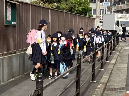 今朝の登校風景です。班長さんが1年生に歩調を合わせて、ゆっくりゆっくり歩いてくれています。