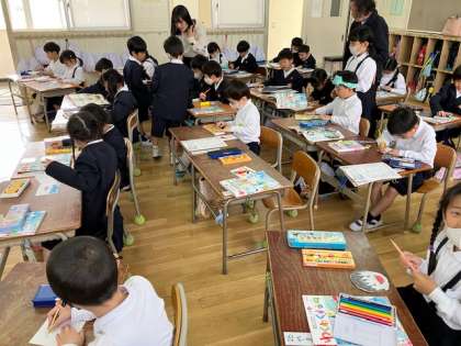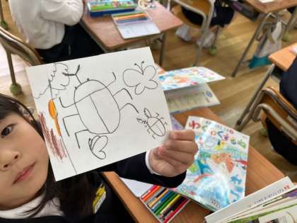 1年生の図工の時間、動物や虫の絵を色鉛筆で描きました。