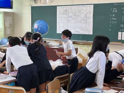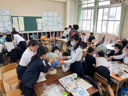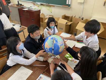 地理の学習で、地球儀を出してきました。珍しいので、みんなワイワイ興奮気味です。