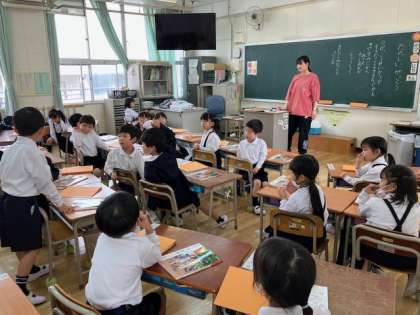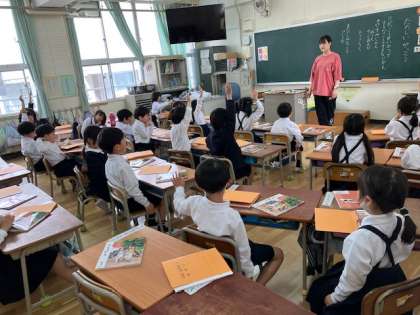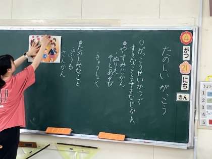 1年生の道徳の時間。「学校生活の楽しいところ」という題材で、意見を出し合っています。