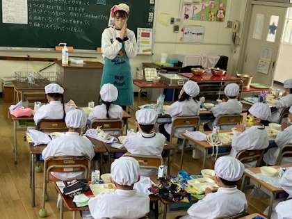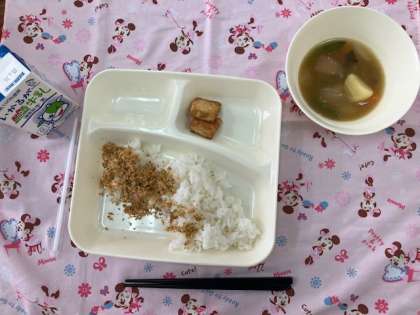 今日の給食献立は、ごはん・鶏肉とじゃがいもの煮物・厚揚げの醤油だれかけ・紅鮭そぼろ・牛乳です。