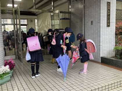 今日は、登校時に雨が降っていました。1年生は傘を使うのに慣れていない子も多く、たたんだりホックを留めたりするのを先生に手伝ってもらいながら、なんとか傘立てに置いていきました。
