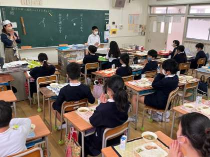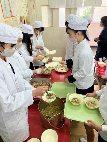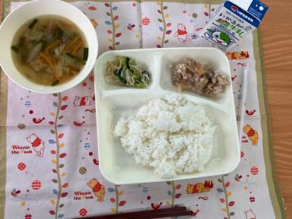 今日の給食献立は、ごはん・鶏肉の唐揚げ・チンゲンサイともやしの甘酢和え・中華スープ・牛乳です。