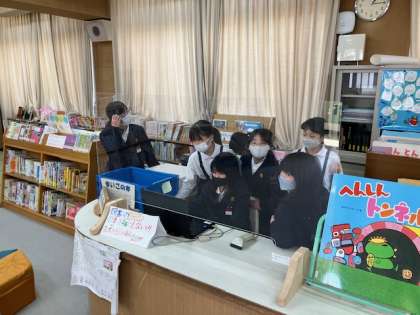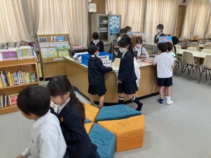 昼休み、図書室で図書委員さんが本の貸し出しをしてくれています。低学年の子どもたちも楽しそうにやってきます!