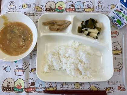 今日の給食献立は、ご飯・きびなごの天ぷら・豚汁・わか竹煮・牛乳です。