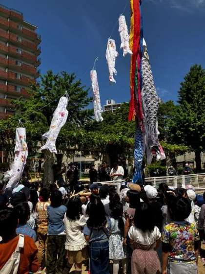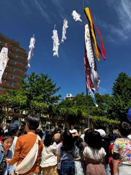 地域のこいのぼりと、子どもたち手作りのこいのぼりが、見事にあがりました!