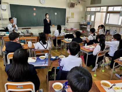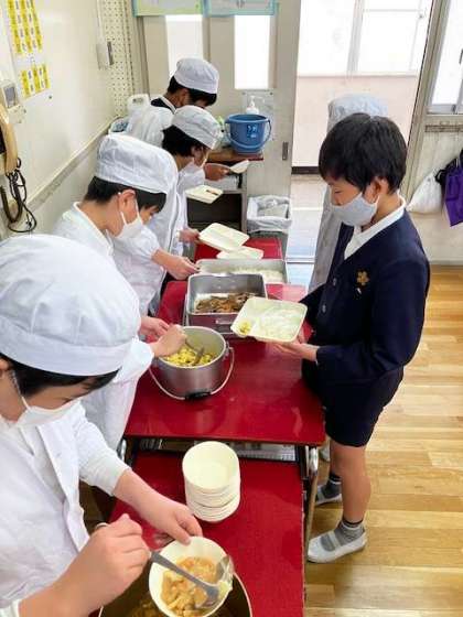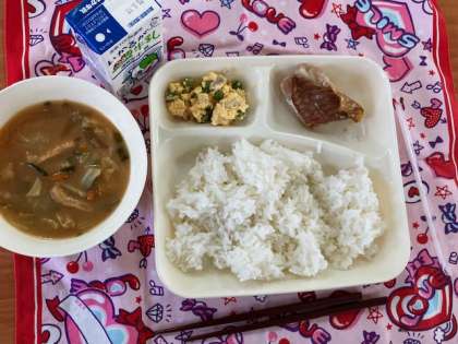 今日の給食献立は、ごはん・赤魚の醤油だれかけ・エンドウの卵とじ・味噌汁・牛乳です。