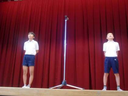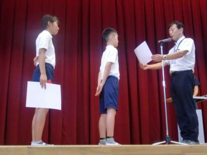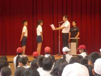 第62回運動会の紅組、白組の応援団長に、それぞれ「認定証」と「はちまき」を渡しました。運動会を盛り上げるように頑張ってください。