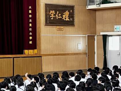 校長先生からは、「譲る」についてお話でした。「サザエさん」の放送の中で、カツオくんとワカメちゃんが買い物で他の子に譲ったお話、そして豊仁小学校の遠足の電車内での座席のお話から、普段の生活でたくさんあるそのような場面で、自分はどうしますか?考えていきましょう、という内容でした。