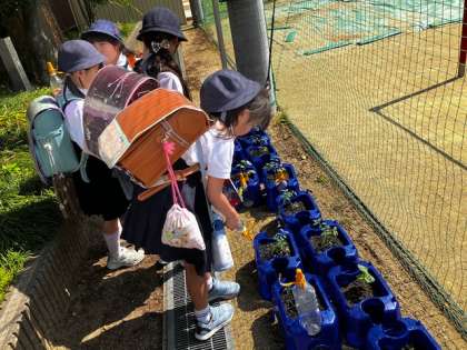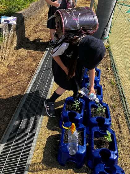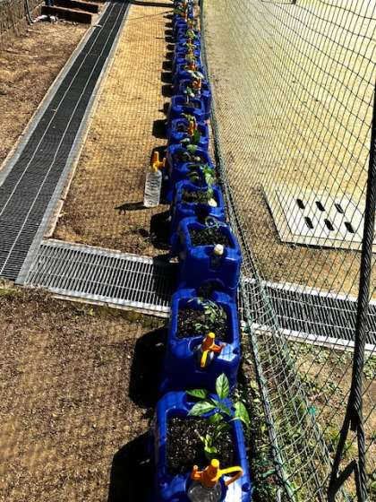 オクラ・ピーマン・ナス・ミニトマト。毎日しっかりお世話をしてあげてます。鉢ごとに「おいしく育ってくださいね〜」の気持ちが伝わっています!