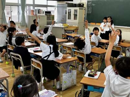 1年生の教室で、運動場で見つけたものを発表しています。それぞれが絵に描いたものを、みんなで当てます。