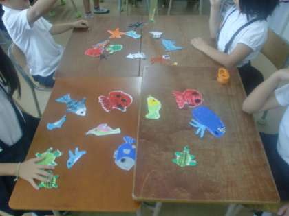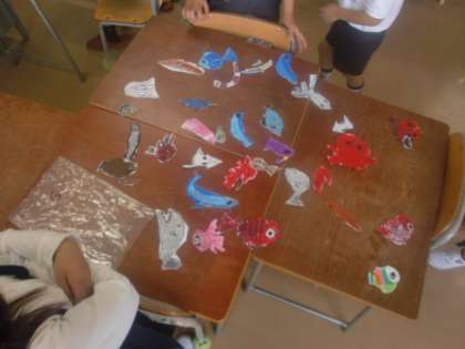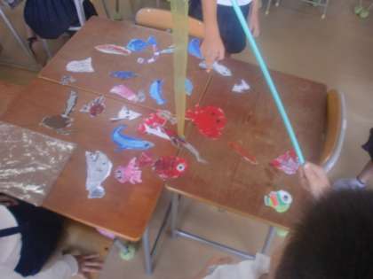 磁石を利用して「魚釣りゲーム」を作りました。今日は、魚を釣ってみました。本当の魚釣りとちがい一度にたくさんの魚がくっついてきた子もいました。