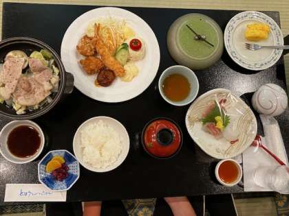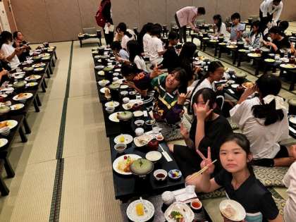 部屋に入った後、避難訓練。その後、すぐに夕食です。子どもたちの好きなメニューが勢揃い!