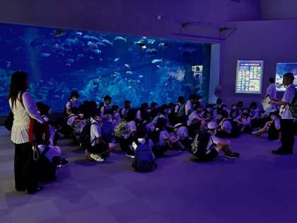 開館前に水族館に到着。団体さん一番乗りで記念撮影、9時開館と同時に入館しました。