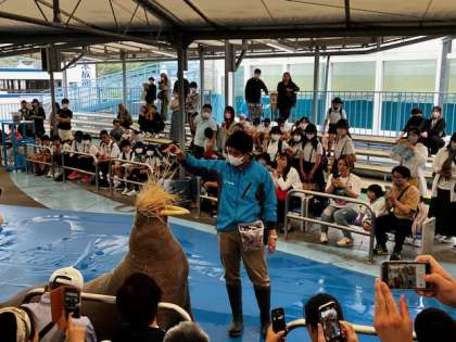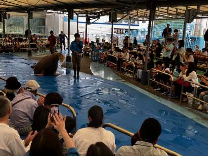 セイウチの触れ合いタイムです。豊仁小学校のだいたい見終えた子どもたちも、集まっています。