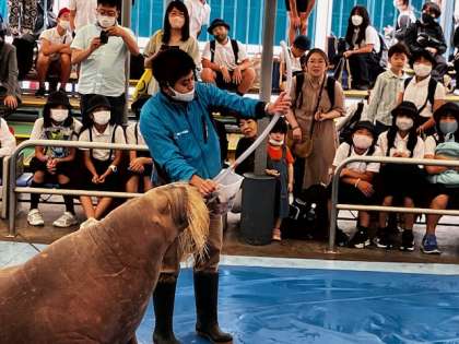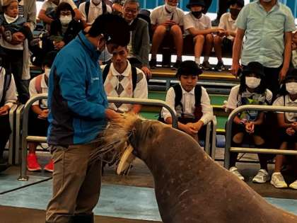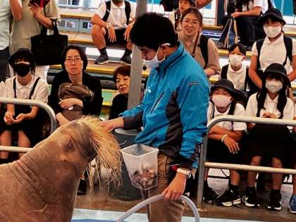 見てると、小さなエサをたくさんもらいます。内容は、サケ、ホタテ、イワシ等、一日に15キロ食べるそうです。噛まずに、吸い込んでるそうです。