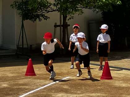 「位置について」でカッコよくスタートポーズ。「ヨーイ ドン!」で勢いよく走りはじめます。