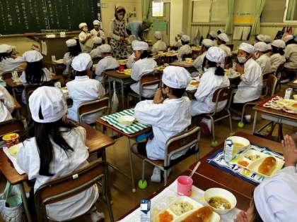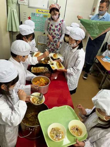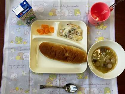 今日の給食献立は、おさつパン・マカロニグラタン・キャベツのスープ・みかん(缶詰め)・牛乳です。
