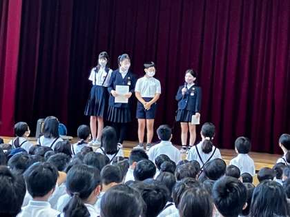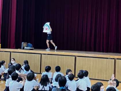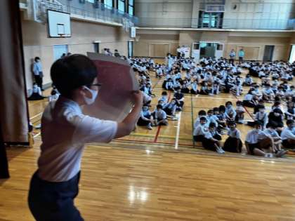今回は「絵当てゲーム」。集会委員さんが絵を持って舞台を走り、その絵は何かを当てるゲームです。