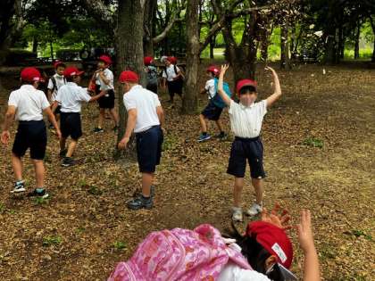 落ち葉がいっぱい。当然、落ち葉攻撃で遊びます。