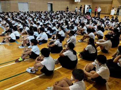 8時30分には、ほぼ全員の全校児童が教室から講堂に入りました。