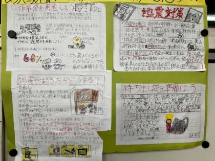 6年生では、防災訓練に向けて「防災ポスター」を作っています。班ごとで、わかりやすいように見出しをつけて、新聞のように誰もが読みやすいように工夫しています。