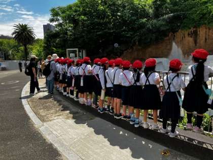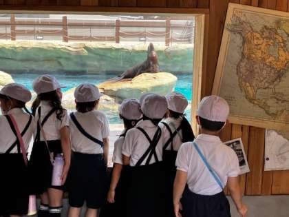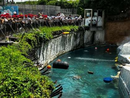 水の中で遊ぶ北極グマを見ています。ズラ〜と並んで見ています。