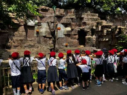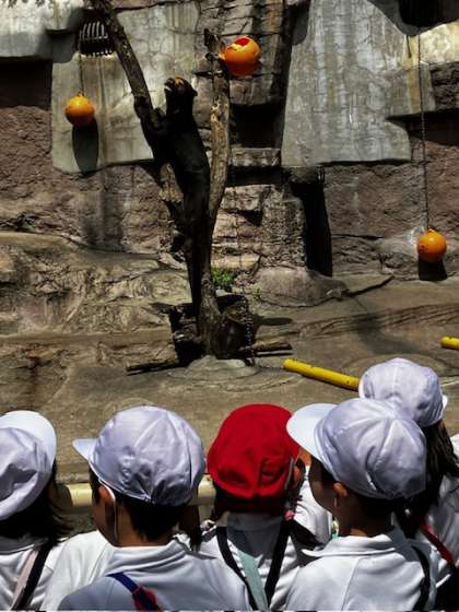 マレーグマのマーサさんがくつろいでいます。みんな、ペンギンでもクマでも、最大の興味で見ています!