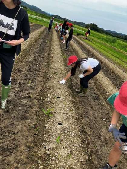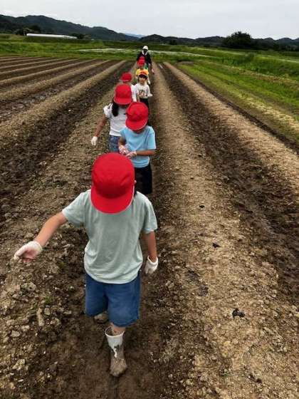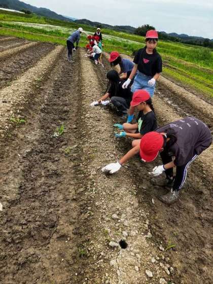 美味しい黒豆の種を植えていきます。2つずつ穴に入れて、土をかぶせます。土に足を取られながら、どんどん植えます。