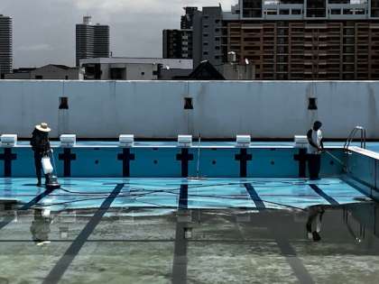 専門業者さんにきれいに清掃していただいています。朝から晩まで1日かけて、まっさらのプールにしてくださいます。