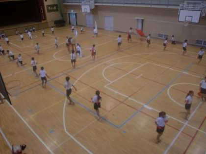 今日は、あいにくのお天気で運動場が使えないので、講堂で行いました。