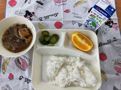 今日の給食献立は、ごはん・すき焼き煮・きゅうりの生姜漬け・オレンジ・牛乳です。