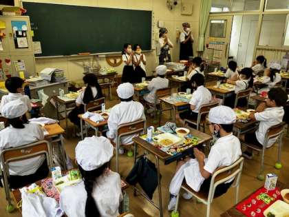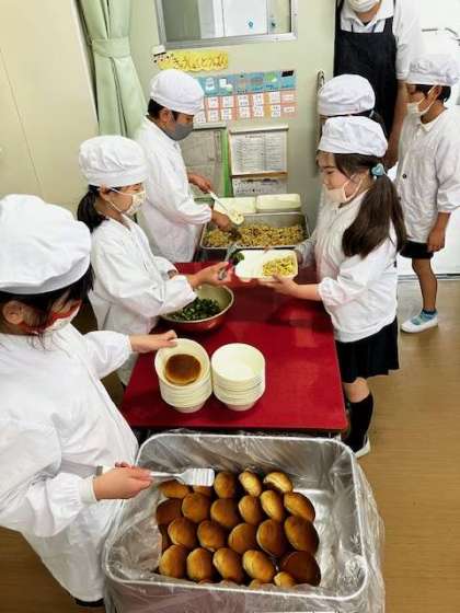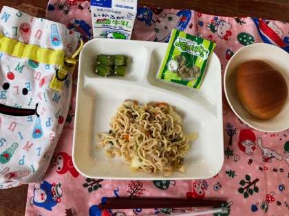 今日の給食献立は、黒糖パン(2分の1)・和風焼きそば・オクラの甘酢和え・抹茶大豆・牛乳です。