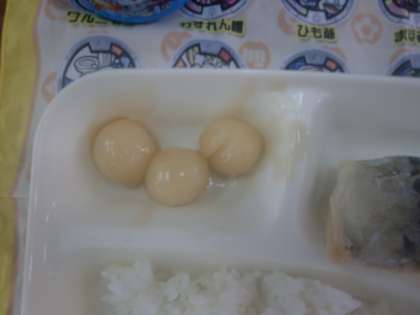 今日の給食は「お月見の行事献立」でした。さごしのしょうゆだれかけ、さといもとこんにゃくの煮もの、みたらしだんごが出ました。