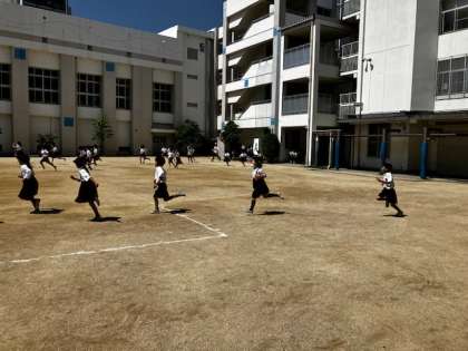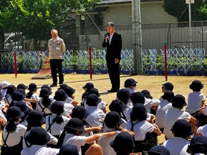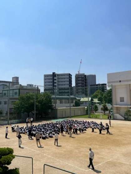 地震がおさまった想定で運動場に避難します。全員が避難したことを確認した後、区長さん、連合町会長さんからお話していただきました。