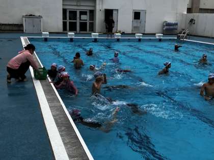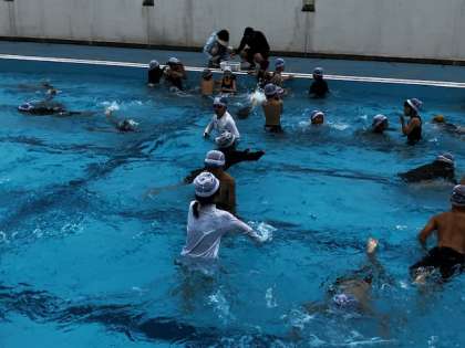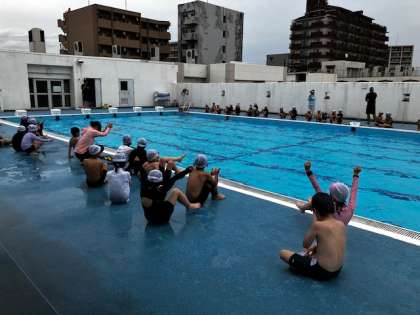 最後に宝さがしゲームをしました。そこに沈んでいるゴムボールを拾います。