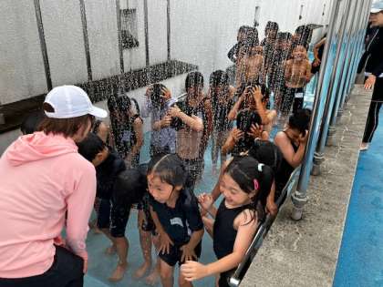 シャワーの所で、絶叫悲鳴が響きます。水に慣れるまで、キャ〜キャ〜