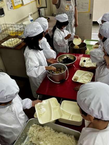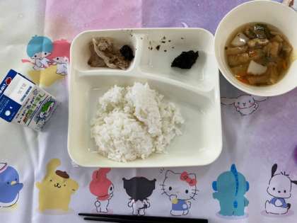 今日の給食献立は、ごはん・豚肉の甘辛焼き・のりの佃煮・五目汁・牛乳です。