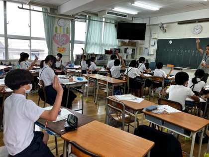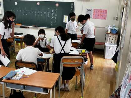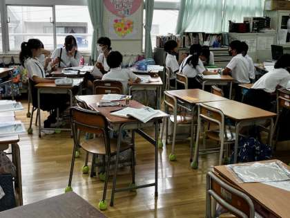 6年生の国語の授業。教科書の「投稿」意見のあり方についての章で、班ごとでの意見交換の授業をしていました。
