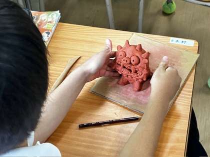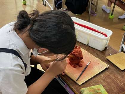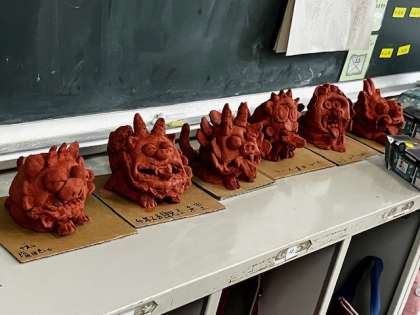 4年生が取り組んでいるシーサーづくり。それぞれなりの世界に一体のシーサーです。