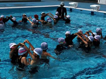 プールに放り込まれたたくさんのゴムボールを拾います。今日は僅差で1組が勝ちました〜。