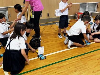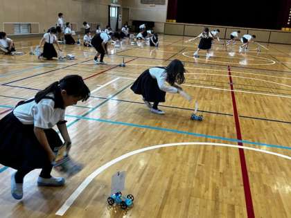 3年生の理科の授業で、動力の実験をしています。帆をつけた車を下敷きであおいで進めます。汗だくです!
