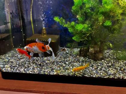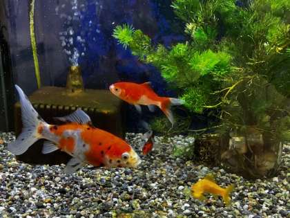 玄関の金魚、春から1匹で生活していましたが、昨日から新たに3匹が仲間入りしました。