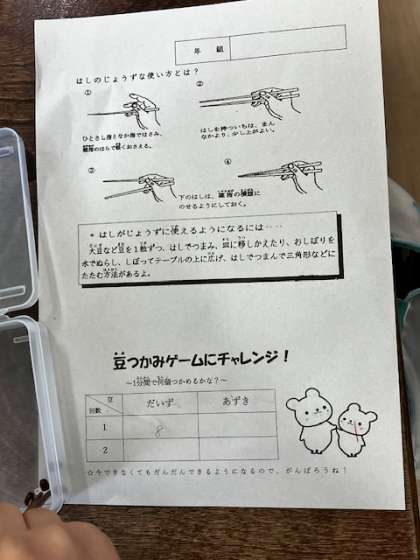 正しいおはしの使い方を確認してから、小豆(あずき)と大豆(だいず)をそれぞれ1分間でいくつつかんで移動できるかのゲームをします。