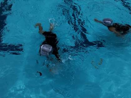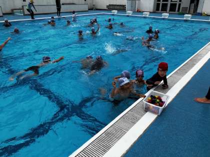 今日は、前半は蹴伸び・バタ足の練習を中心に、後半は宝さがしを2回戦行いました。