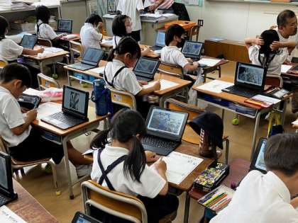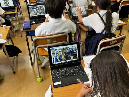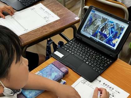 プールの後すぐの授業ですが、パソコンを使って野菜の栽培日記を書いています。
