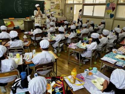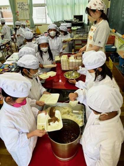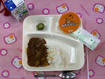 今日の給食献立は、夏野菜のカレーライス・キャベツときゅうりのサラダ・みかんゼリー・牛乳です。